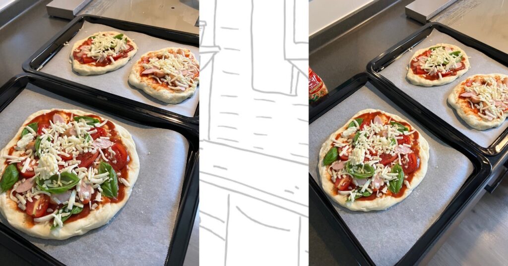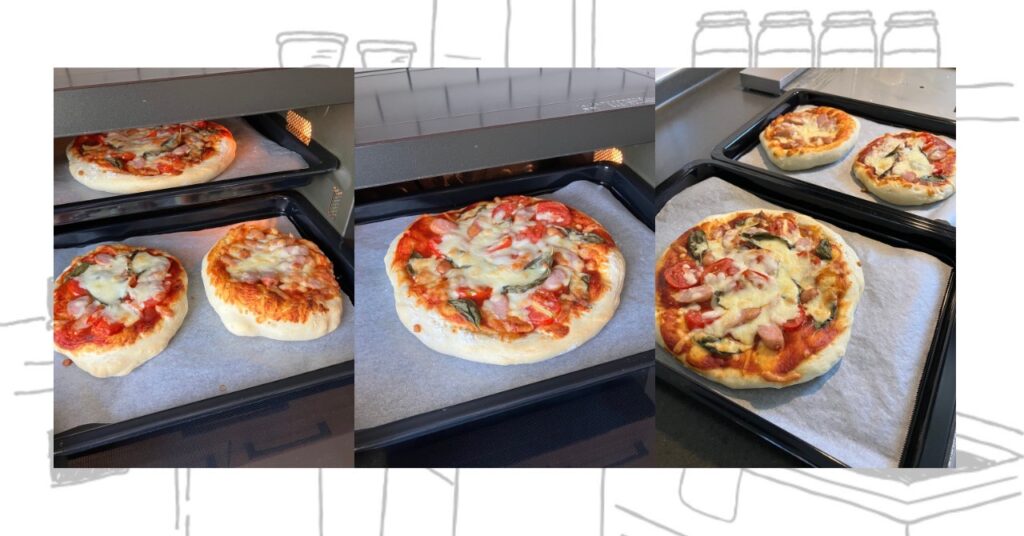 - 子供の推し工程:生地を手でのばす/トッピングを考える/焼き上がりチェック!トッピングを自由にさせたら、トマト・バジルを抜いていました😂